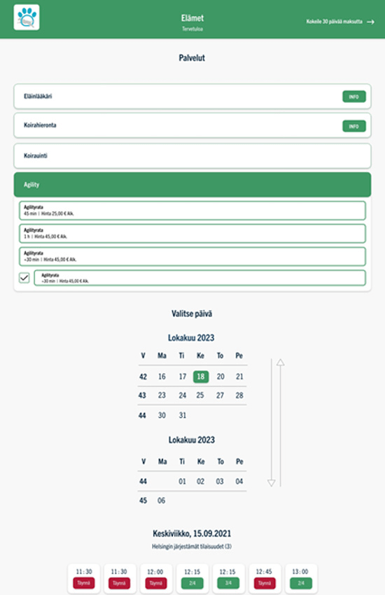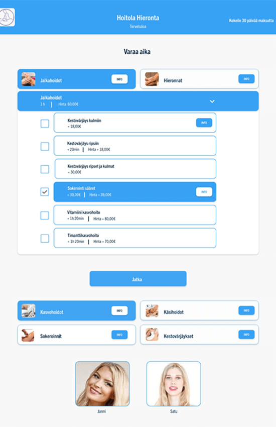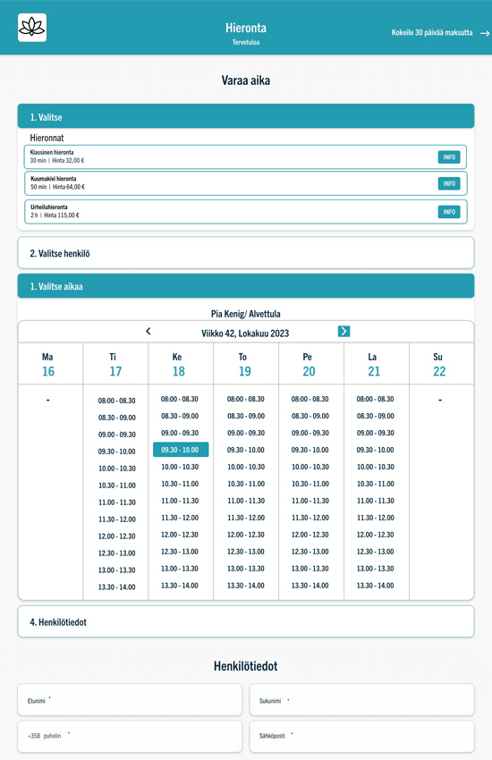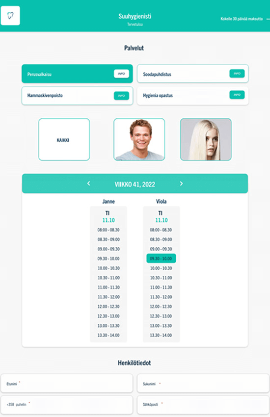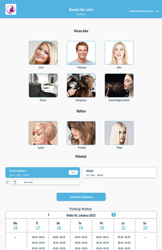 Tarjoa asiakkaillesi mahdollisuus varata aikojasi Kellon ympäri. Moderni ja helppokäyttöinen ajanvarausohjelmisto.