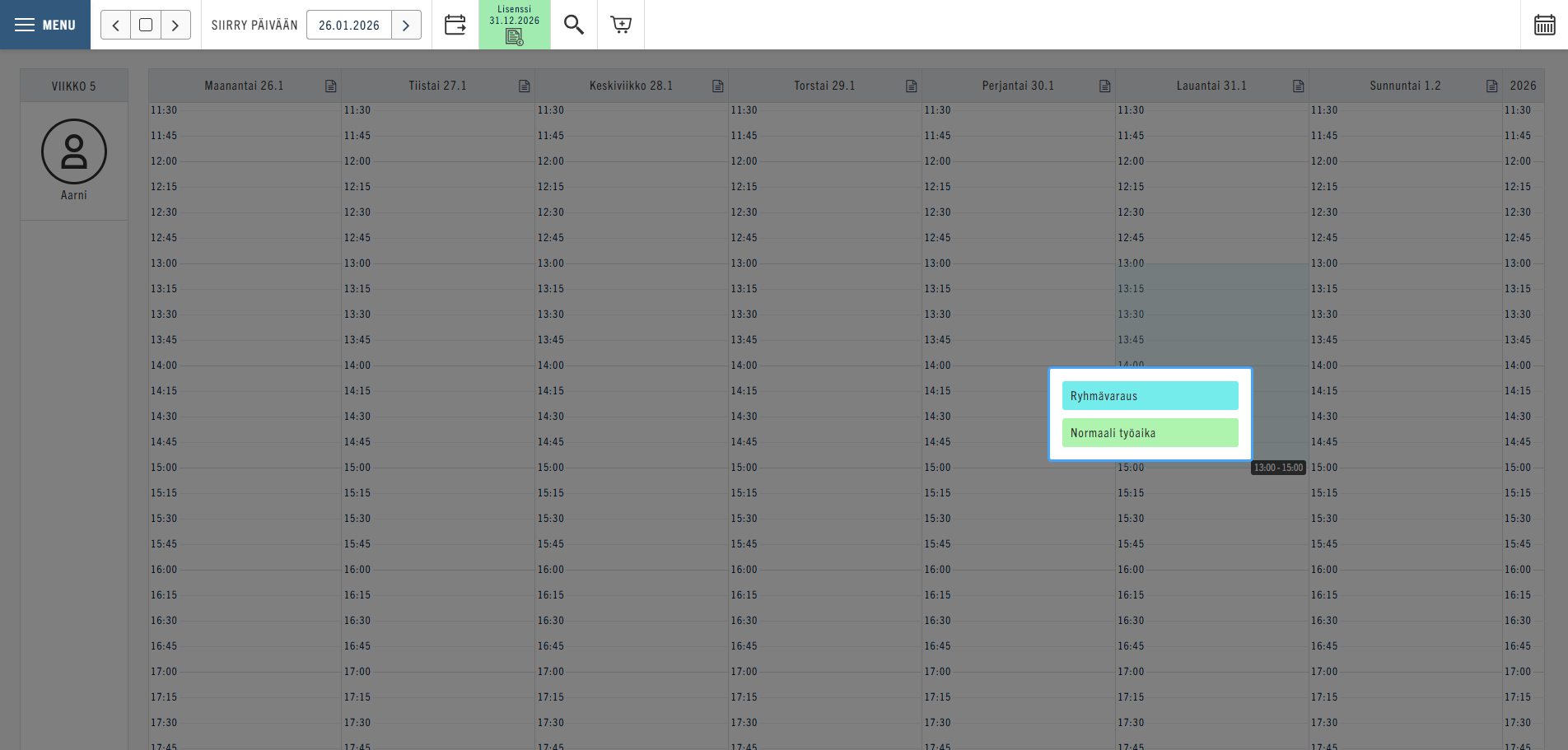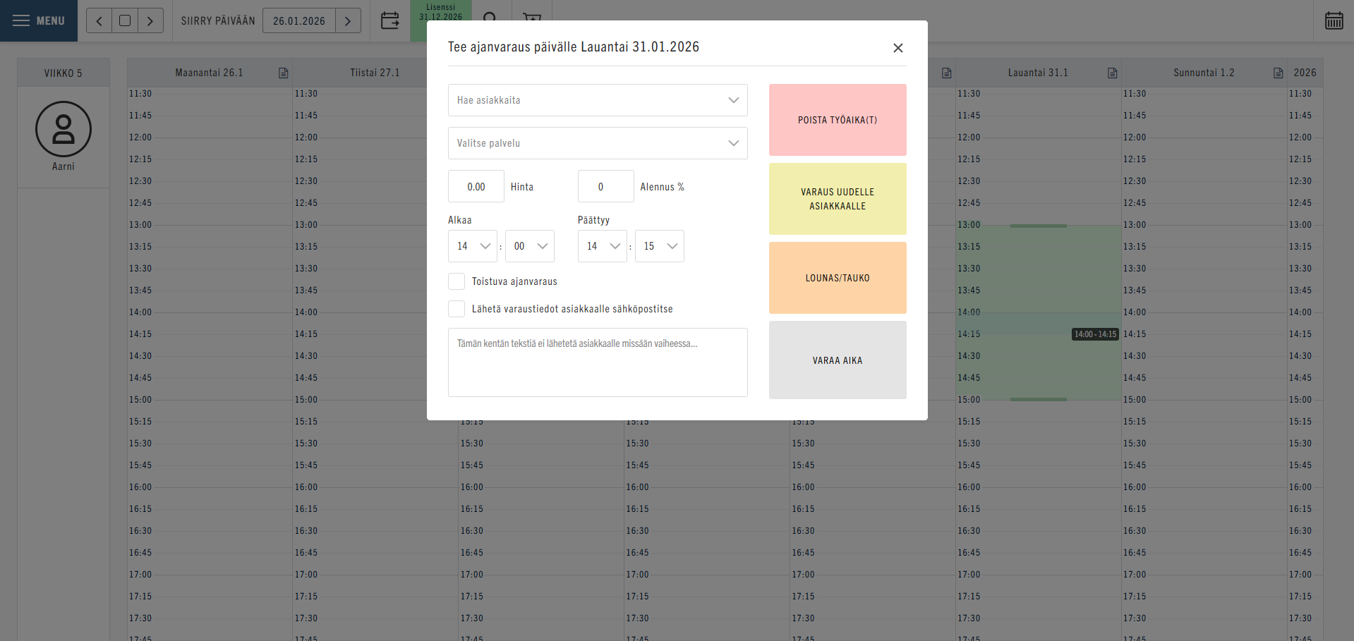 Vapaita aikoja avataan maalaamalla kalenteria ja valitsemalla ”Avaa työaika” tai ”Ryhmävaraus”. Vain avatut ajat näkyvät asiakkaille.